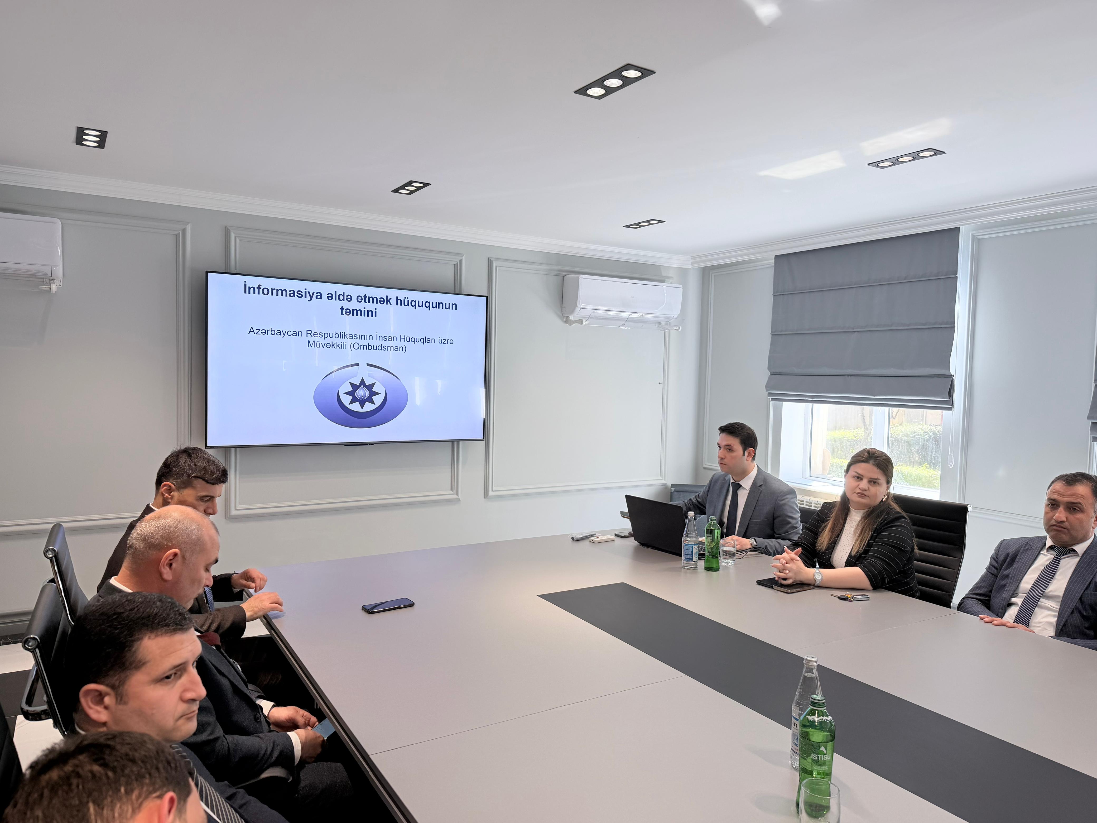 Tədbirdə Ombudsman Aparatının İnformasiya əldə etmək hüququnun müdafiəsi şöbəsinin müdiri Lamiyə Zeynalova və şöbənin Təhlil və monitorinqlər sektorunun müdiri Vəli Quliyev çıxış edərək, “İnformasiya əldə etmək haqqında” Azərbaycan Respublikası Qanununun əsas müddəaları, informasiya sahiblərinin vəzifələri, informasiya sorğularına baxılma qaydaları, cavablandırma müddətləri, habelə qanunvericiliyin tələblərinin praktik tətbiqi məsələləri barədə ətraflı məlumat veriblər.