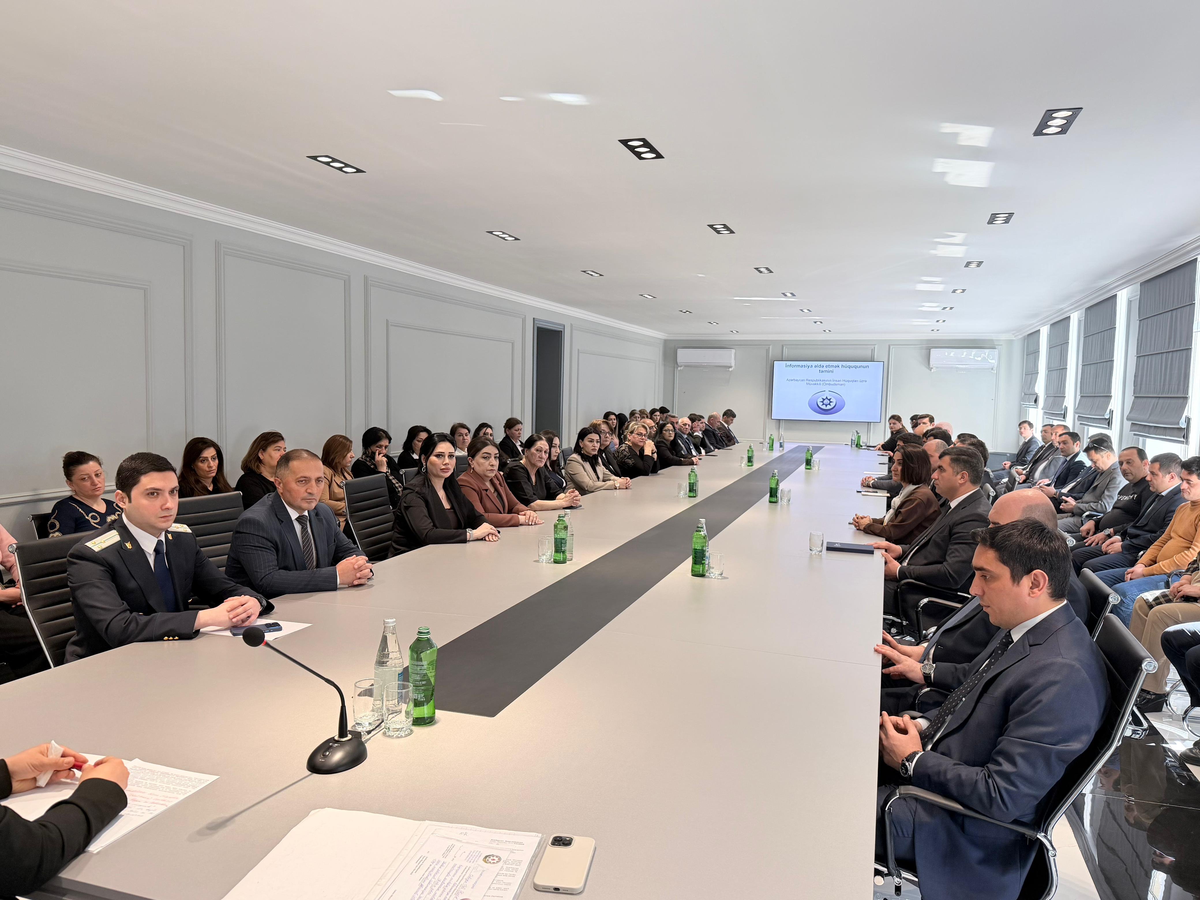 Tədbirin sonunda mövzuya dair hazırlanmış videoçarx nümayiş olunub, informasiya əldə etmək hüququnun təşviqinə xidmət edən maarifləndirici çap materialları, metodiki vəsaitlər iştirakçılara təqdim olunub və informasiya əldə etmək hüququnun daha səmərəli təmin edilməsi məqsədilə dövlət qurumları ilə Ombudsman Aparatı arasında əməkdaşlığın gücləndirilməsinin əhəmiyyəti vurğulanıb.